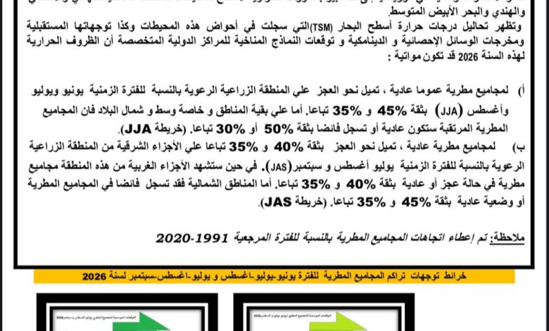 أصدرت الهيئة الوطنية للأرصاد الجوية، التابعة لوزارة التجهيز والنقل مذكرة توضح اتجاهات كميات الأمطار التراكمية المتوقعة خلال موسم الأمطار لعام 2026، وذلك للفترتين الممتدتين من يونيو إلى أغسطس (JJA) ومن يوليو إلى سبتمبر (JAS).