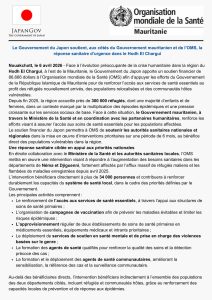 أعلنت اليابان عن تقديم دعم مالي جديد لتعزيز الاستجابة الصحية والإنسانية في ولاية الحوض الشرقي، شرقي موريتانيا، وذلك بالتعاون مع كل من منظمة الصحة العالمية واليونيسف.