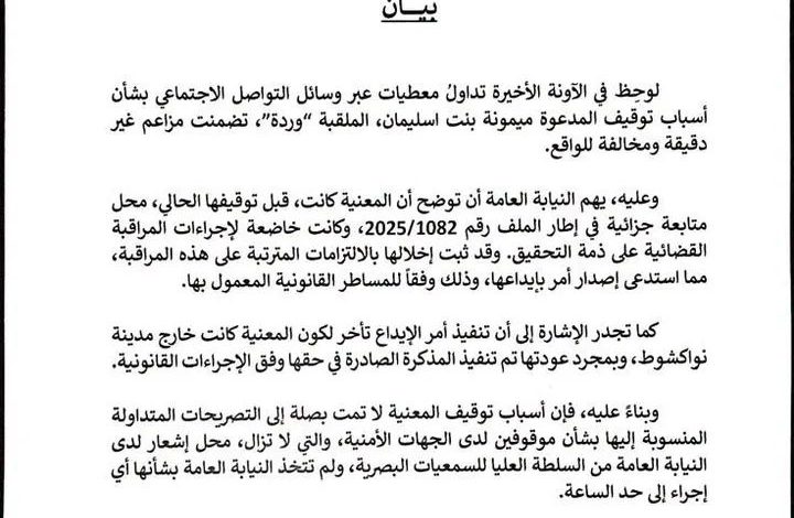 أصدرت النيابة العامة بيانًا توضيحيًا بشأن توقيف المدعوة ميمونة بنت اسليمان، الملقبة “وردة”، وذلك على خلفية تداول معطيات عبر وسائل التواصل الاجتماعي اعتبرتها غير دقيقة ومخالفة للواقع.