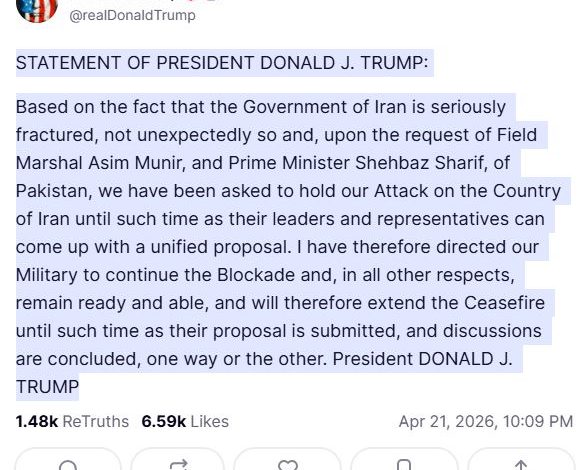 وقال الرئيس الأمريكي في بيان على منصة “تروث سوشيال”: “نظراً للانقسام الحاد الذي تشهده الحكومة الإيرانية، وهو أمر متوقع، وبناءً على طلب المشير عاصم منير ورئيس الوزراء الباكستاني شهباز شريف، طُلب منا تعليق هجومنا على إيران إلى حين تقديم قادتها وممثليها مقترحاً موحدا”.