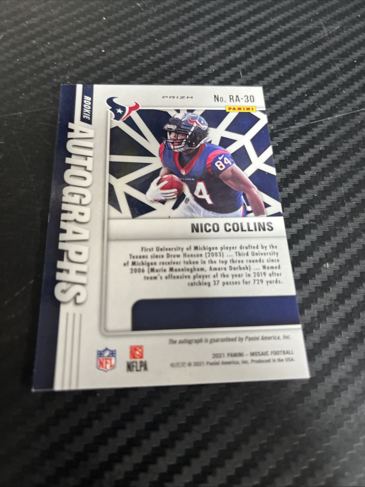 Elevate your sports card collection with the 2021 Panini Mosaic Nico Collins Auto Rookie Prizm. As a standout addition, this card features the promising Houston Texans wide receiver and is part of the sought-after Rookie Autographs insert set. Authenticated by Panini Authentic, the card boasts an autograph from Nico Collins himself, adding a personal touch to this unique piece.The card, numbered RA-30, is a Prizm variety, ensuring its shine and appeal among collectors. It represents a memorable season for both Collins and football enthusiasts who follow the National Football League. Secure a piece of sports history with this distinctive trading card from the 2021 Panini Mosaic collection.