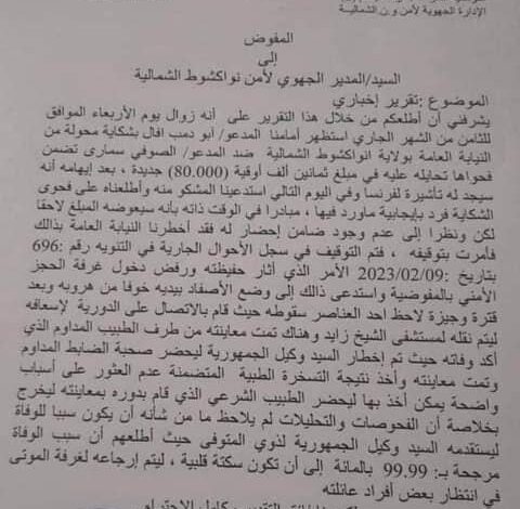 وحسب هذا التقرير الذي يحمل تاريخ 09 فبراير 2023، يوما بعد الحادثة فإن محاولة الإجبار ولد الشين أدت إلى «إعيائه بدنيا وأدى لاحقا لوفاته بعد استقدامه لمستشفى الشيخ زايد».