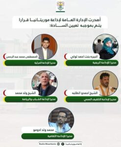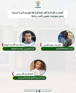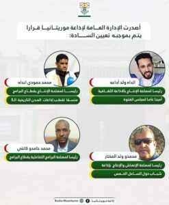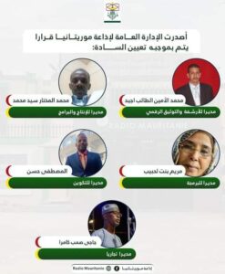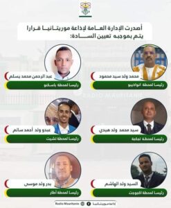 أجرت الإدارة العامة لشبكة إذاعة موريتانيا تغييرات فى أطقم الإذاعات والاقطاب المتنوعة التى تم تأسيسها خلال السنوات الثلاثة الأخيرة